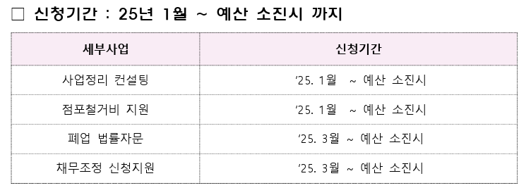 | 원스톱 폐업지원 | 폐업(예정) 소상공인 | 점포 철거비 최대 400만원 지원 |